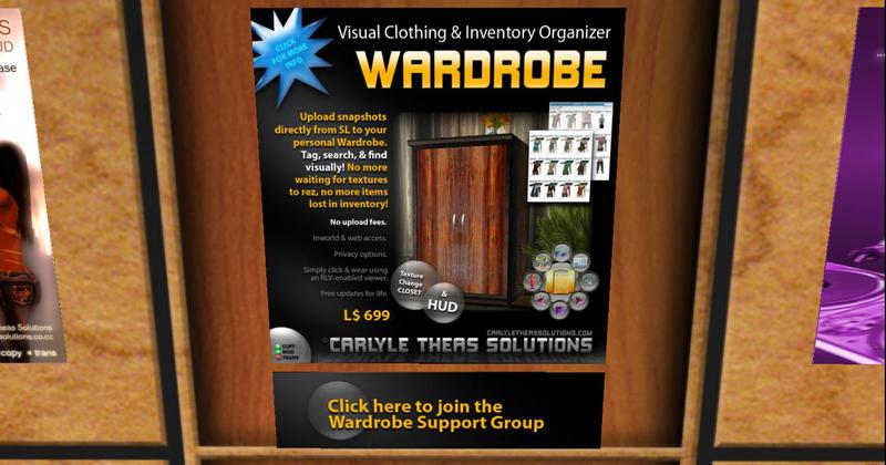 "Wardrobe" is (CTS)s new must-have: a easy-to-use organizer for your outfits. Upload snapshots of your outfits to your personal Wardrobe website and wear them with a single click! No paying fees for texture uploads, no waiting for textures to rez!