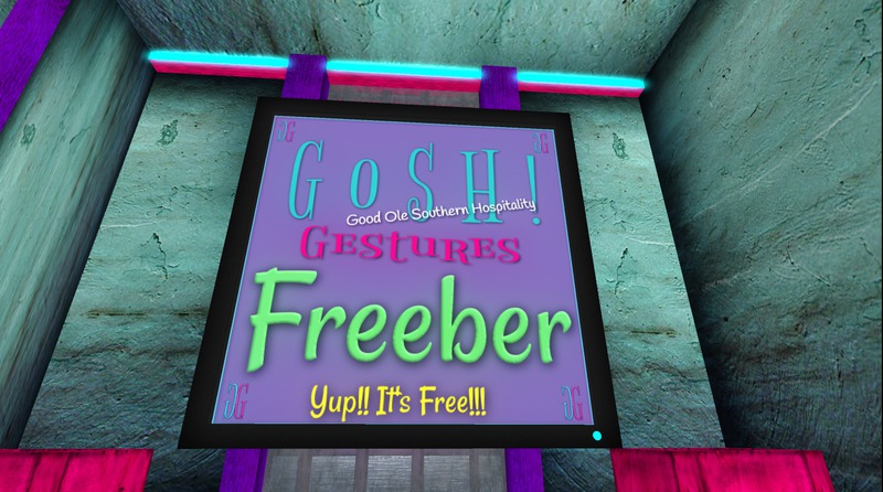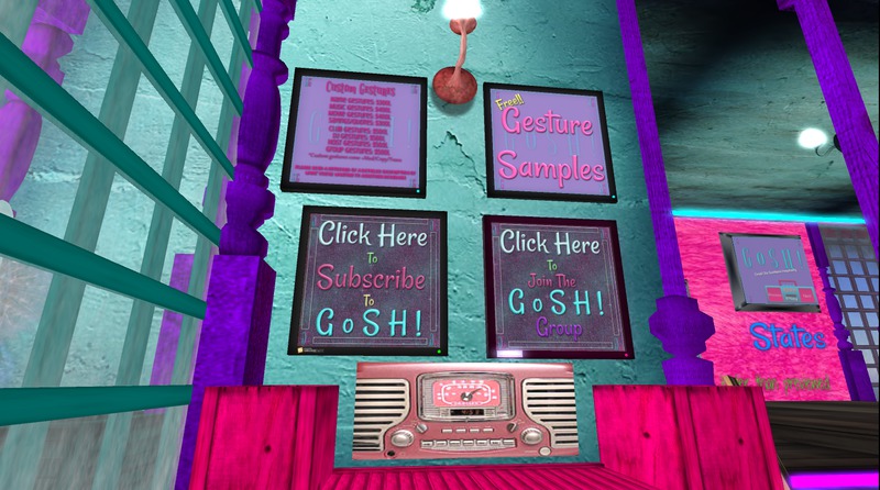 Gosh is a gesture store located in Second Life. All kinds of different unique gestures are available for purchase. This store immediately appealed to me because of the fun colors. The building is bright green with teal accents. I love stores that have colorful fun themes. They instantly draw me in. ...